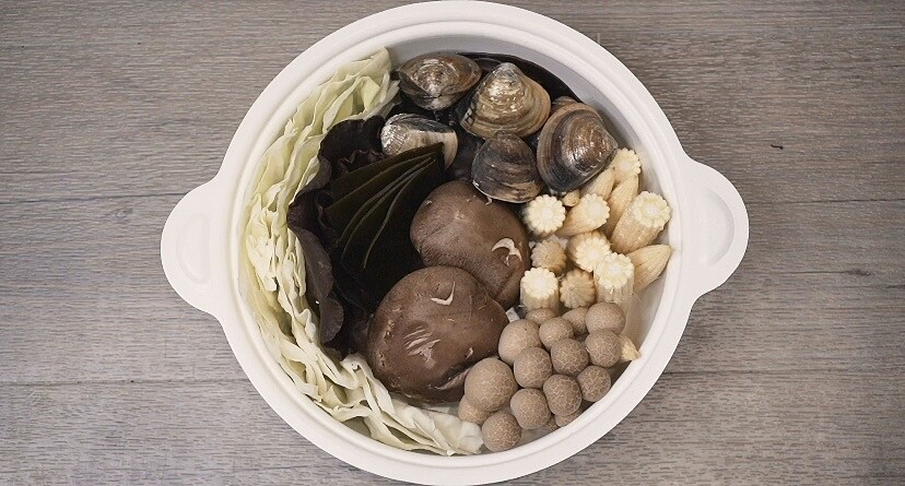 /食材清單/鮮香菇2朵、鴻禧菇適量、玉米筍適量、高麗菜1/4顆、黑木耳4朵、蛤蠣數顆、昆布1條、無糖高纖豆漿600cc