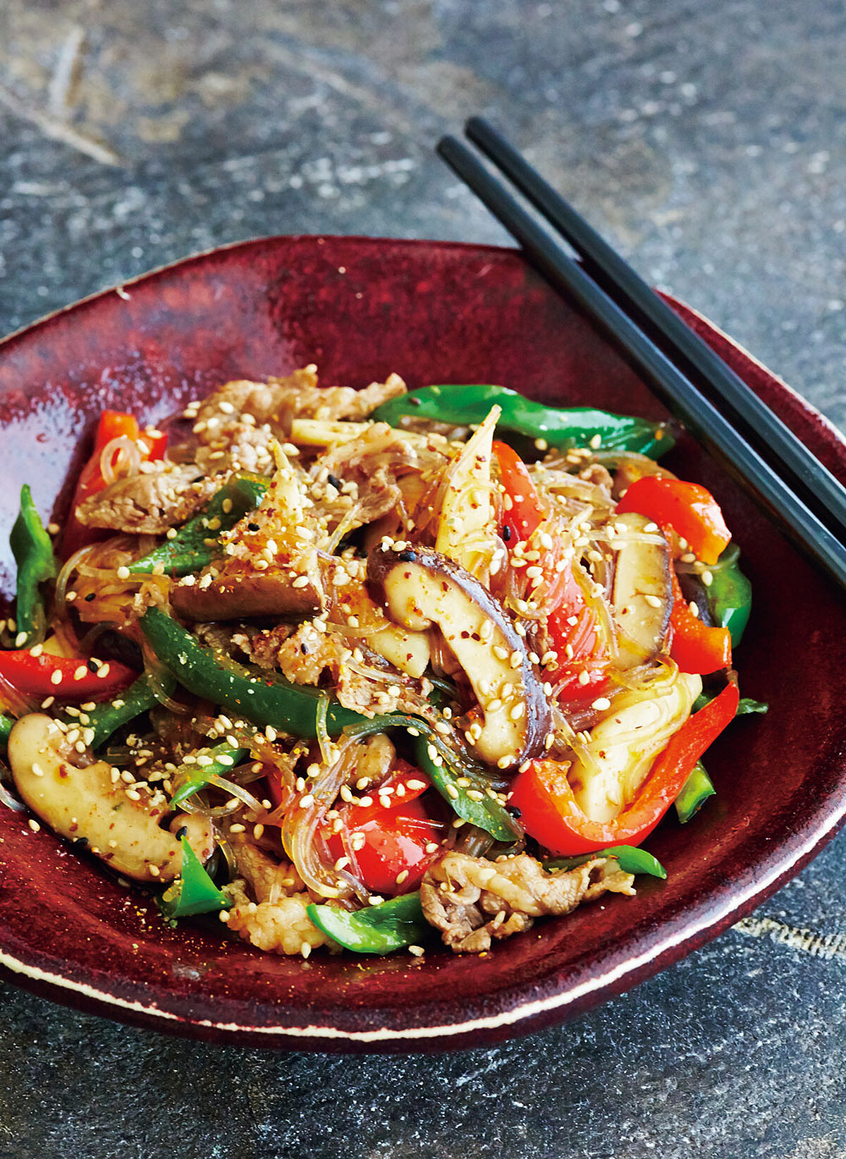 材料(2 人份):牛肉切邊肉100g、杏鮑菇1 朵(50g)、香菇2 朵、青椒2 朵、甜椒(紅) 1/2 顆、綠豆粉絲50g、蠔油1 大匙、韓式辣椒醬、料理酒各2 小匙、麻油1大匙、炒熟白芝麻、七味粉…各適量