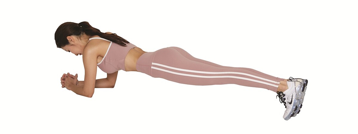 1 棒式:雙手、肩膀撐在墊子上與墊子垂直,雙腳伸直,讓耳朵─骨盆側面─踝骨成一直線,腹肌與臀肌,也就是核心肌群用力支撐住身體,以強化肌力。
