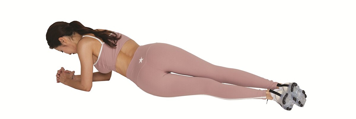 1 手肘放在墊子上支撐上半身,雙腳張開與骨盆同寬,從側面看過去時從頭到腳會呈一直線。