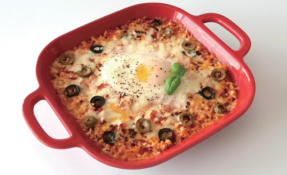 2. 容器裡放進攪拌好的食材,中間打顆蛋後,鋪上橄欖、紅辣椒片和披薩起司。→ 用叉子將蛋黃戳洞,防止加熱時雞蛋爆開。