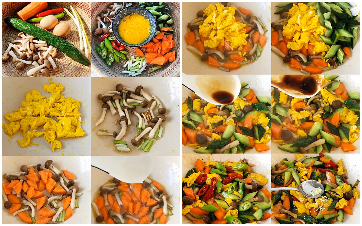 /清單食材/黃瓜一條,胡蘿蔔1小塊,雞蛋2顆,鴻喜菇一把,蔥一條,小辣椒,紅辣椒