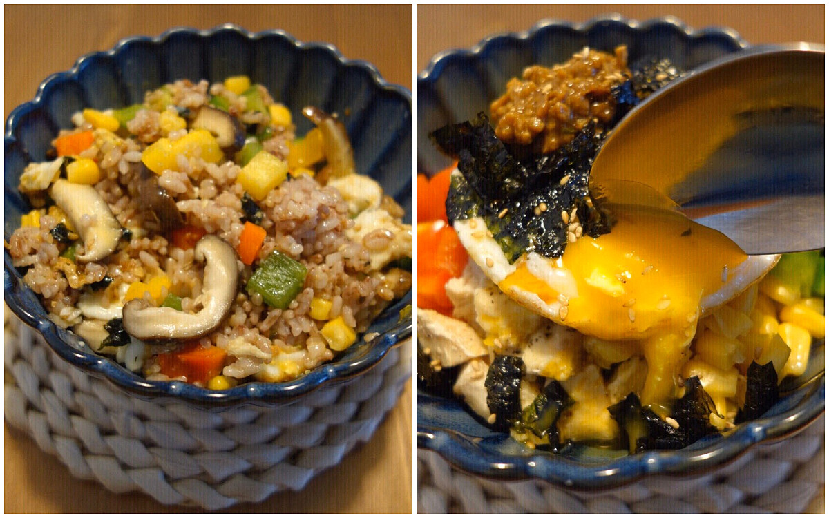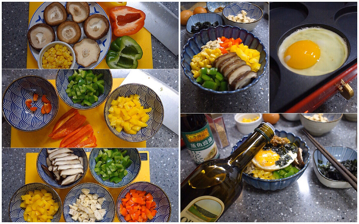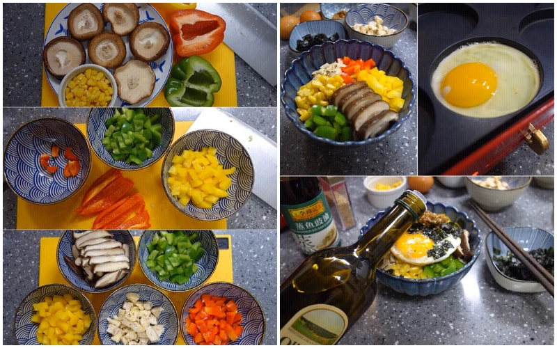 /清單食材/糙米(或藜麥、五穀雜糧等等適個人口味)80g、玉米粒40g、香菇3朵、彩椒紅綠黃各1/6顆 (總份量相當於半顆彩椒)、烤好的雞胸肉50g、雞蛋一顆、蒸魚豉油、黃豆醬少許、橄欖油少許、白芝麻、海苔