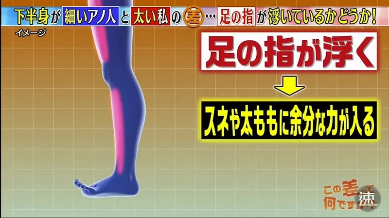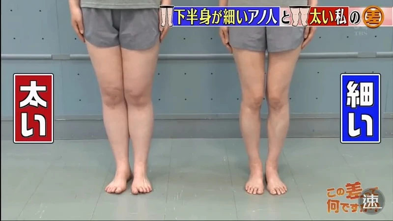 綜藝節目《この差って何?》中,邀請了接骨院院長笠原巖拆解腿粗的成因,笠原院長表示,除了父母遺傳和生活習慣之外,腳趾的受力情況也是成因之一。節日組找來上半身一樣大小的女生,但發現腳趾能貼地的女生雙腿較瘦,而另一位較粗。