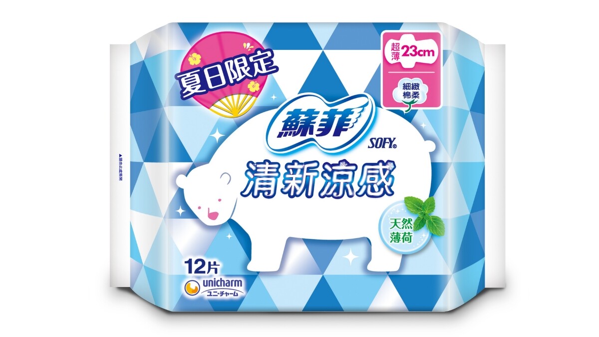 蘇菲的涼感衛生棉分成兩系列,藍色的「清新涼感」含有天然薄荷因子,調和多種天然植物精油,清涼舒適,穿上瞬間即有清涼感。更貼心的是每一片都是密封單片包設計,可以長效維持棉片涼感。