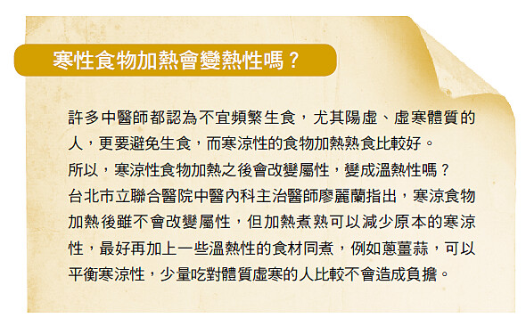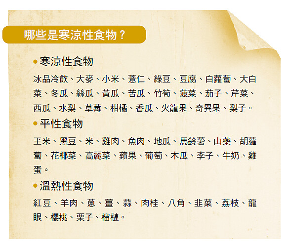 台北市立聯合醫院中醫內科主治醫師廖麗蘭指出,晚上到清晨這段時間,外在環境溫度低,寒氣最重,同時也是人體陽氣較弱的時候,身體易受寒,最好避開生冷食物。