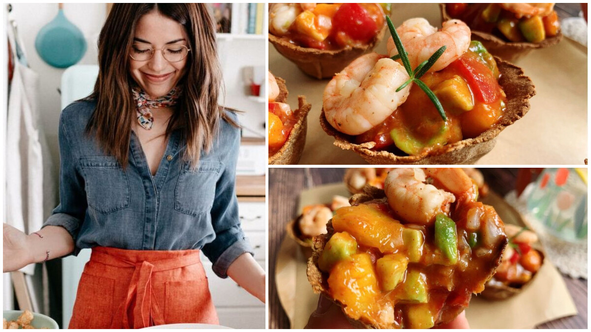 4.蝦仁、洋蔥下鍋炒熟,再將脆脆杯從烤箱取出,放入靈魂色拉,再放上蝦仁就完成了!