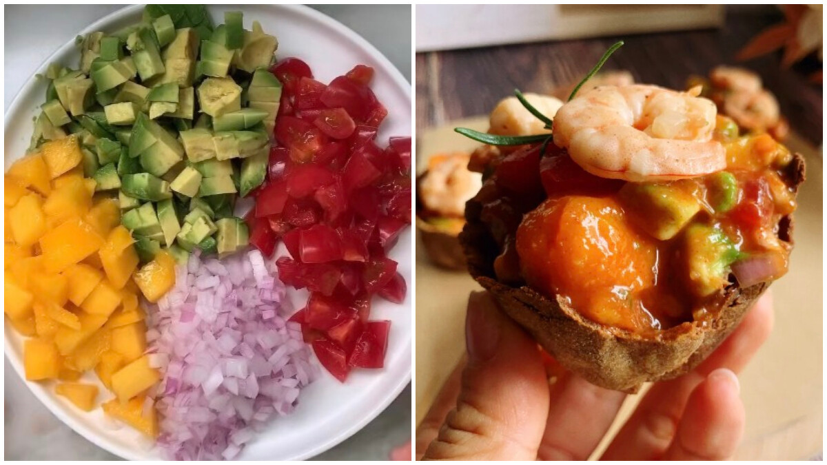 /食材清單/蝦仁、小番茄、洋蔥、酪梨、芒果、鹽、黑胡椒、檸檬片、料理米酒