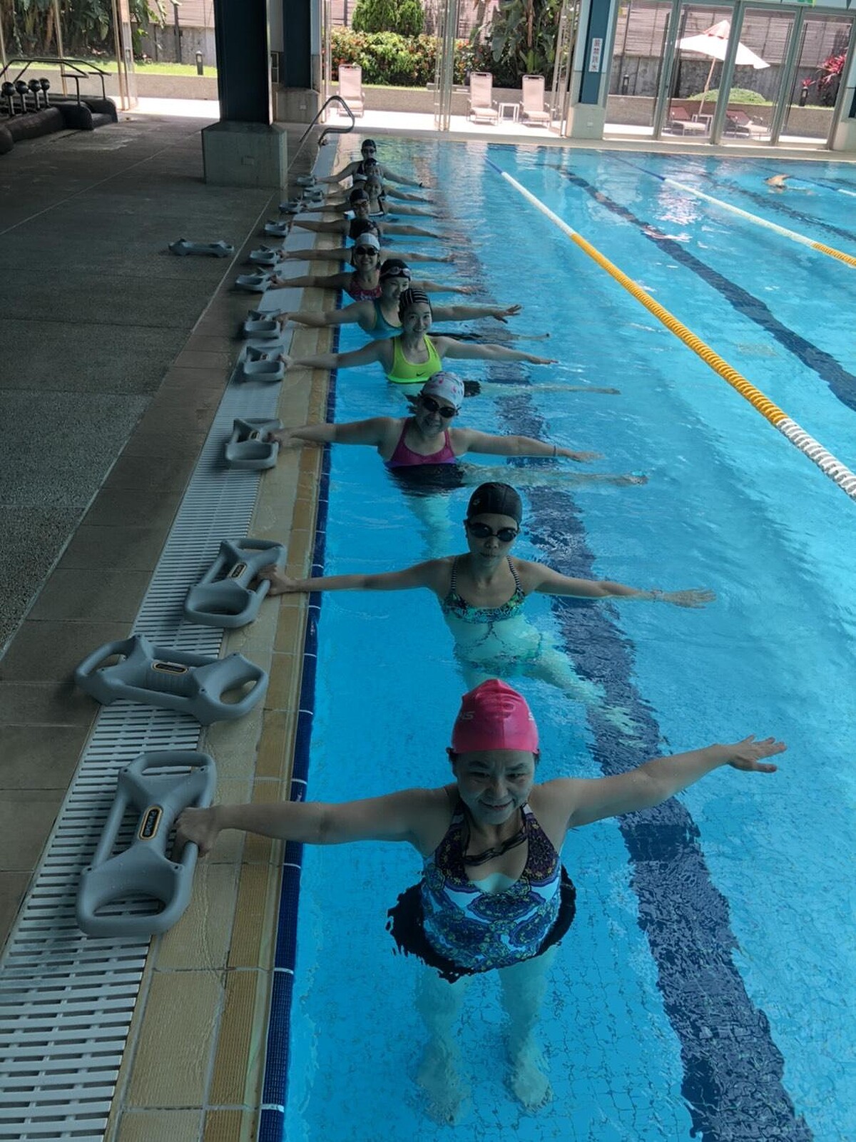 游泳池有六個標準水道,長25公尺寬15公尺,透光,還有挑高的屋頂,全年都是24小時過濾的溫水,恆溫還有冷暖空調29-31度。天氣好的時候可以將涼椅拉到戶外曬曬太陽,或是在室內享受按摩池,釋放肌膚深層的壓力。