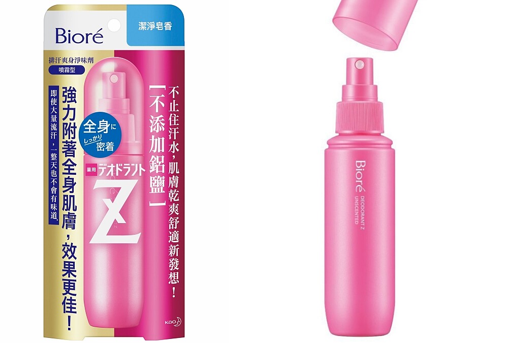 屬於體香膏。由超有活力的日本女星渡邊直美代言,BIORE Biore排汗爽身淨味劑Z系列(DEODORANT Z)粉紅色外表深受不少女生歡迎。主打日本研發的耐汗水持久抗菌技術,在大量流汗下抑制汗味與異味。特別是噴霧,可以上下倒置,能輕鬆噴灑無法觸及的部位,例如背部等等,非常貼心。