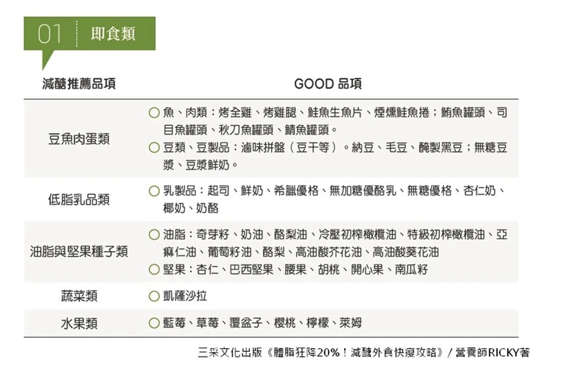 今天Ricky就要教外食族去超市/大賣場如何聰明選食,基本上的原則是從食物六大類的觀念來延伸,包括挑選好油脂(包括堅果類)。一般來說,看營養標示裡的碳水化合物、糖份數值即能做挑選,此外就是看蛋白質含量。而由於NG品項太多,以下就直接說明GOOD品項!