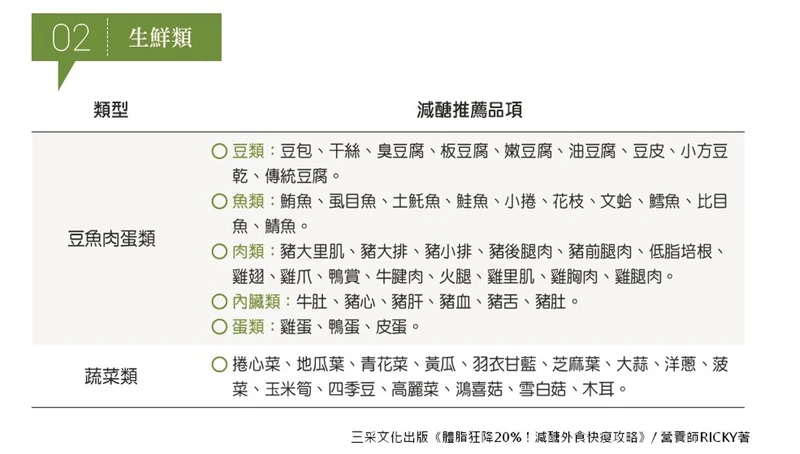 鮭魚、金豐盛雞胸肉、豬牛羊里肌肉等生鮮食品(富含好油脂,適合用來補充蛋白質)。