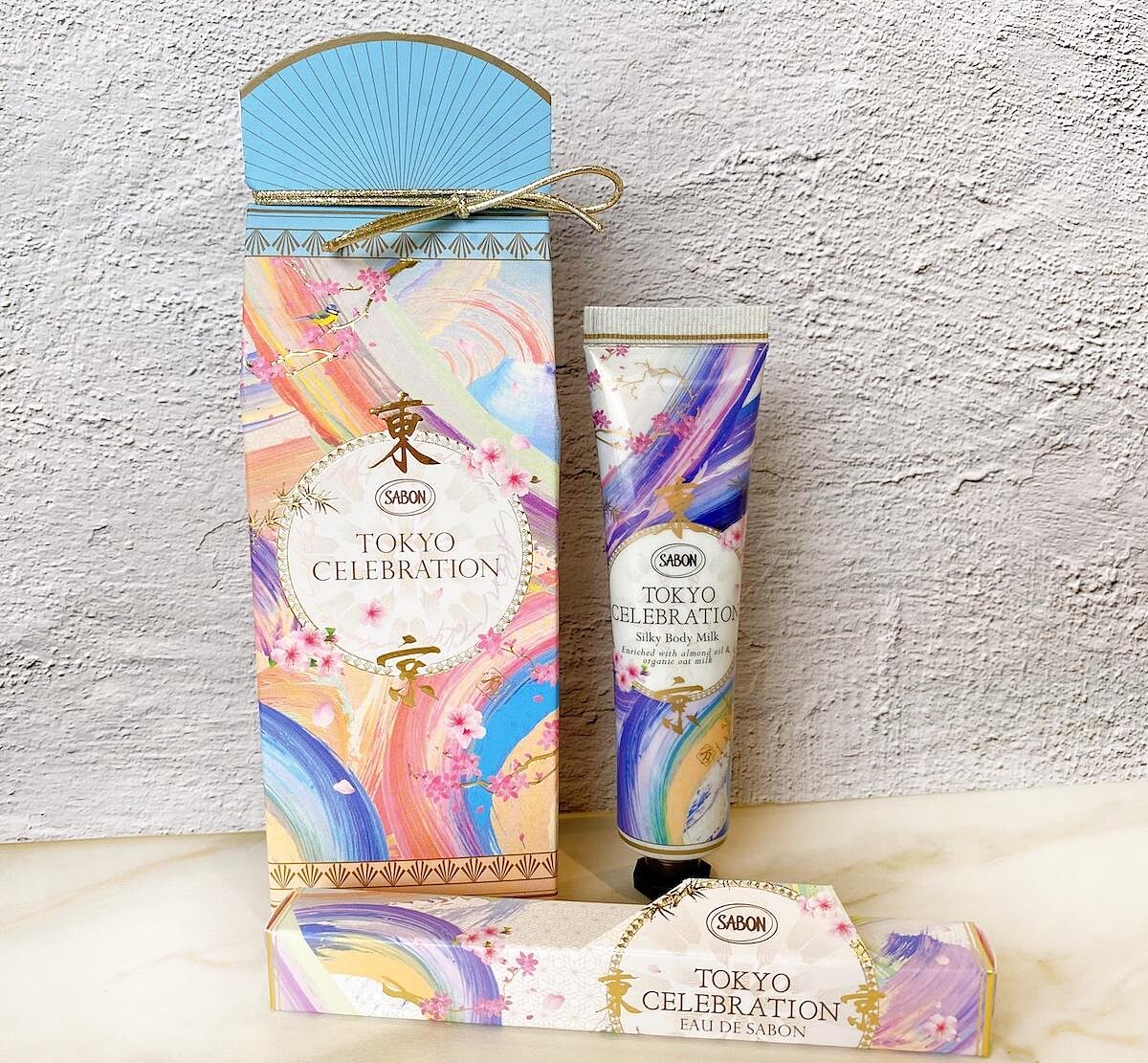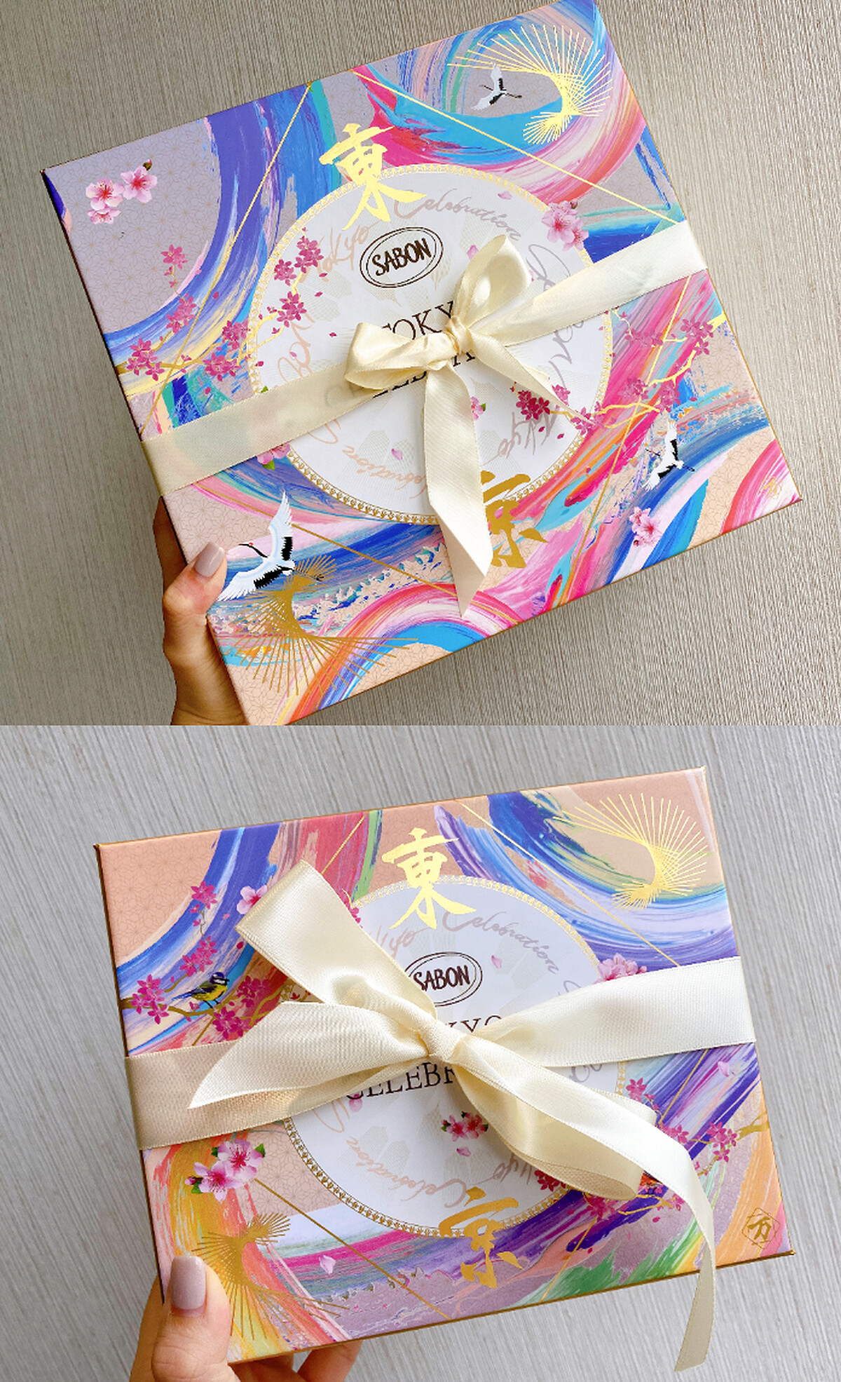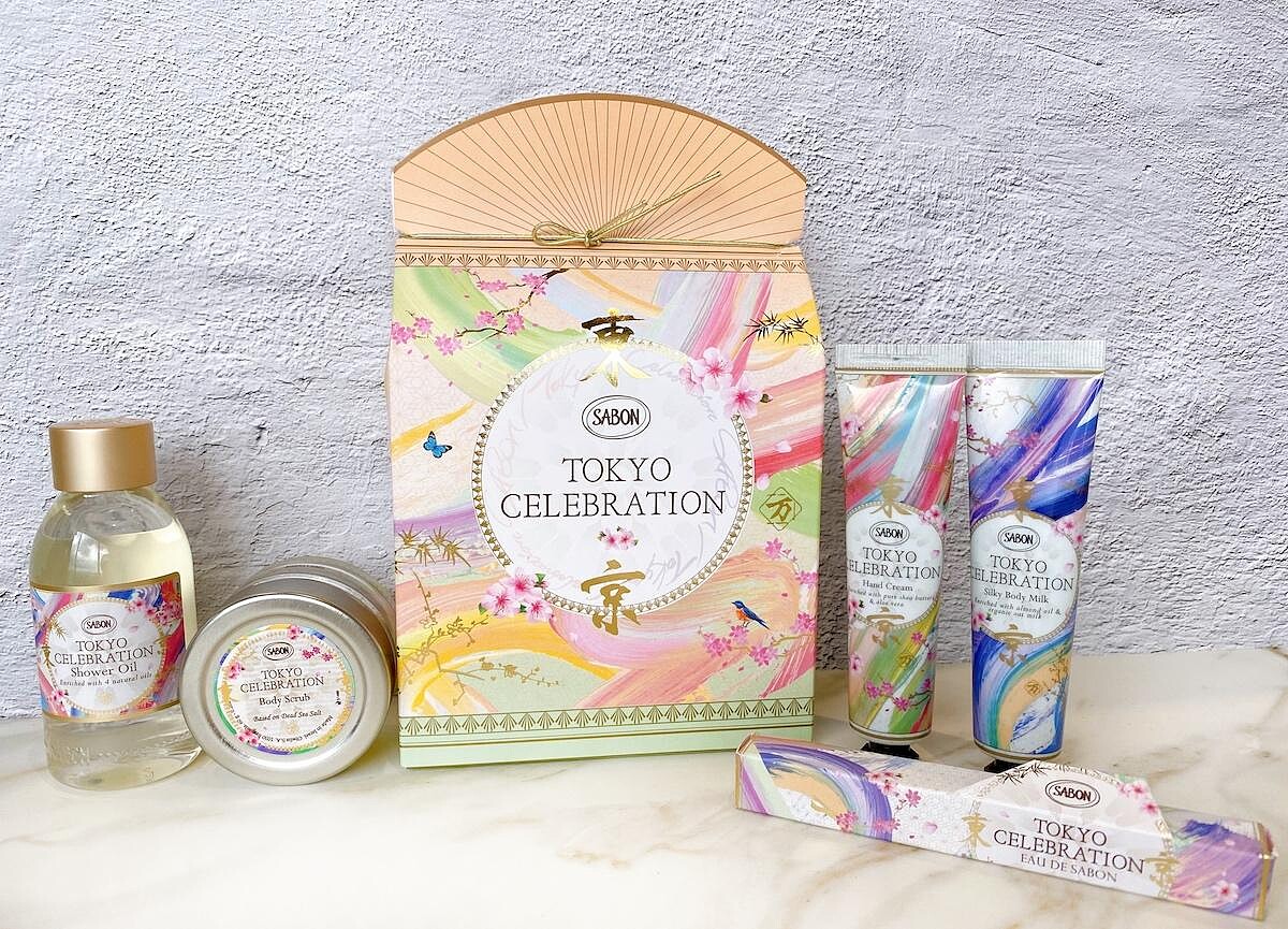 呼應東京主題以及對於SABON印象,万美選擇以粉彩色系融合書道呈現日本四季更迭之景,將揮灑的粉彩隨筆觸線條流動於禮盒上,為SABON打造出夢幻的絕美限定包裝,盒上還印有燙金的「東京」二字。凡購買滿NT2,500元以上,即可享有限量禮盒包裝服務。