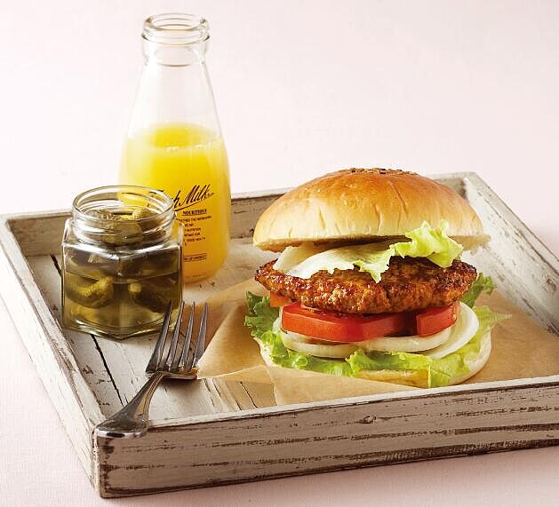 5將調味後的麵包依序放上萵苣、洋蔥、酸黃瓜、番茄及肉排,大功告成!