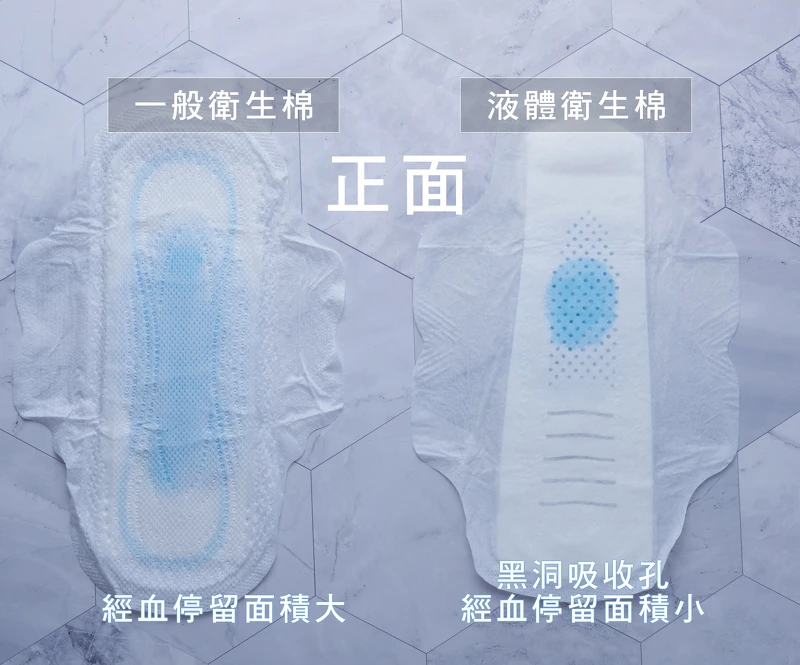 獨有黑洞吸收孔,可以將經血一吸到底,讓表層經血停留面積超小,卻一樣能吸好吸滿,因為經血都被拉到底層啦~反觀一般衛生棉,吸收一樣量的經血,但也同時停留在表層超大一片….難怪妹妹會這麼悶濕不適。光是這一點,就讓M編立馬頭也不回地奔向液體衛生棉!