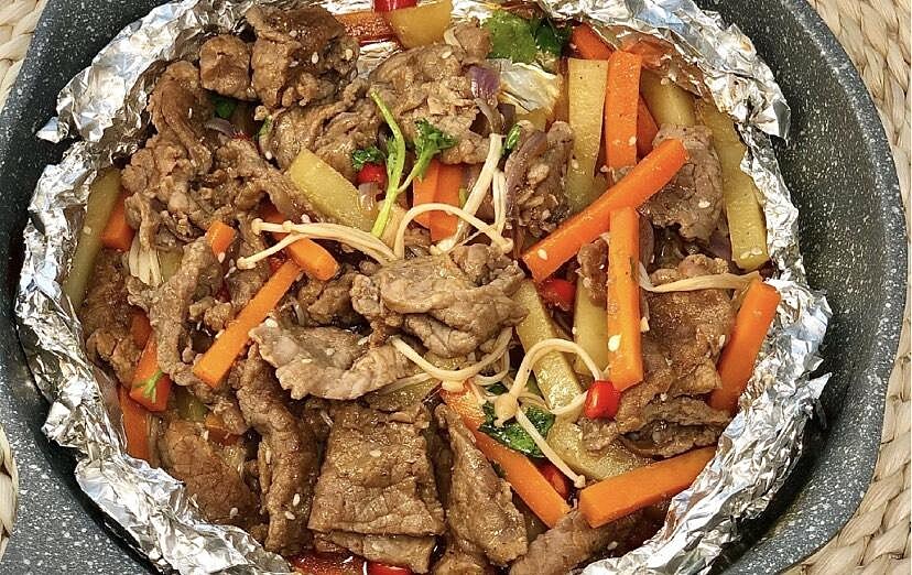4.醃好的牛肉鋪最上層,再蓋一層錫箔紙,兩層錫箔紙四邊捲好捲滿。
