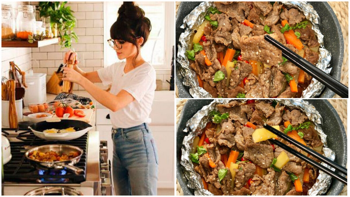 5.放入平底鍋蓋蓋著,中小火燜10分鐘即可,劃開錫箔紙撒上黑胡椒、白芝麻、小辣椒和香菜就完成了喔。