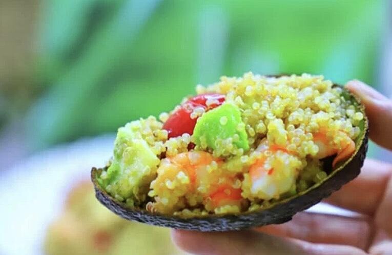 /食材清單/白藜麥100克,酪梨1顆,鮮蝦8隻,小番茄6顆,鹽少許,橄欖油適量,料理米酒少許,黑胡椒粉適量