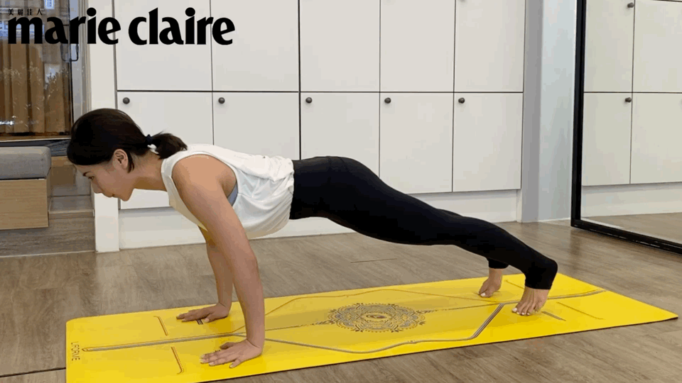 動作解說:從下犬式核心穩定接到平板式,注意腰部打直,收腹收臀,不聳肩,來回15下,共做3組。