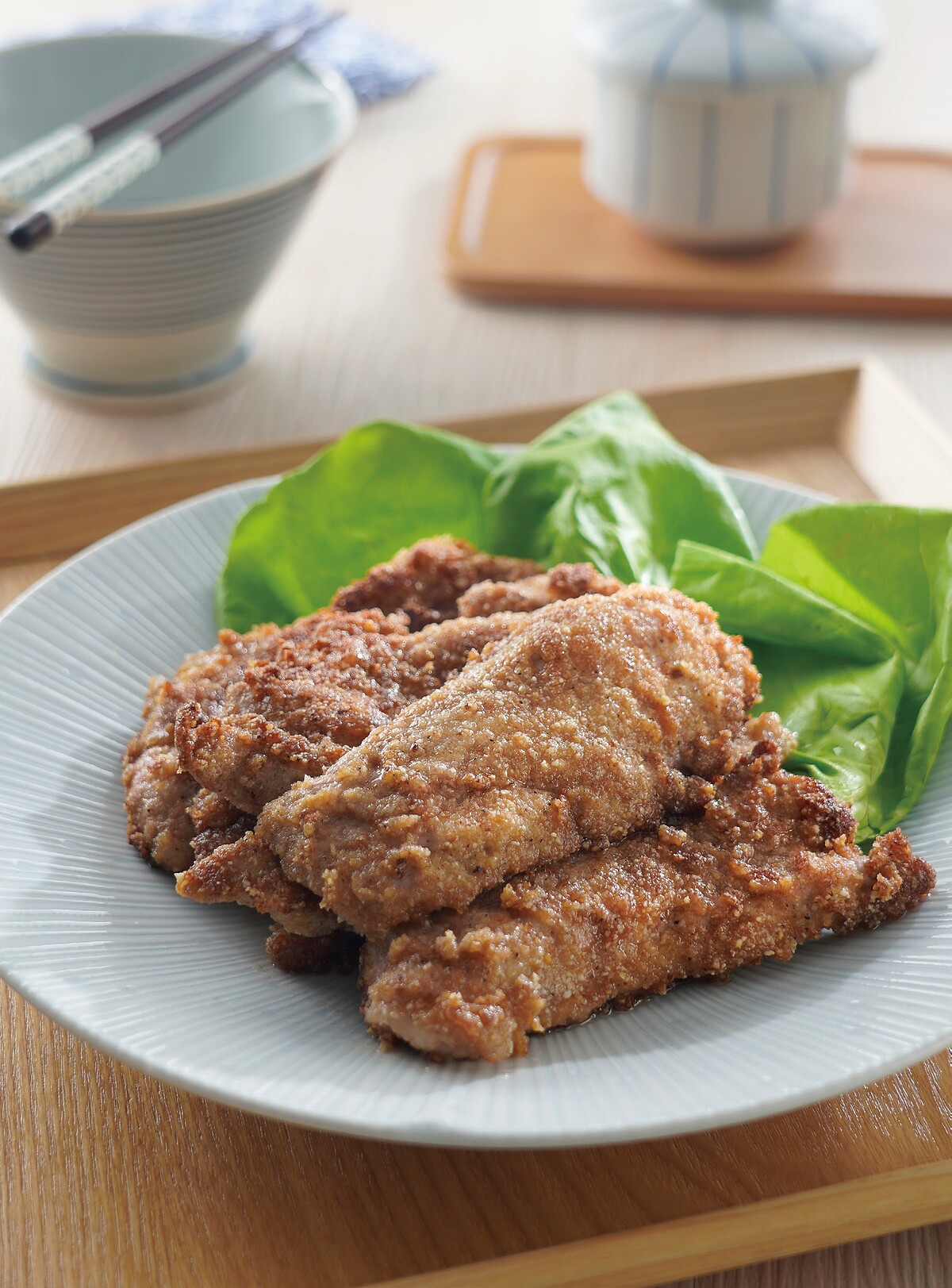 /清單食材/梅花肉片300克(約5片),炸油適量(橄欖油、豬油或烹飪椰油皆可)。醃料:無糖醬油30克,米酒5克,蒜泥少許,胡椒粉少許,五香粉少許,玫瑰鹽適量。粉皮:杏仁粉(烘焙用)50克,帕瑪森起司粉5克,玫瑰鹽適量,黑胡椒適量。
