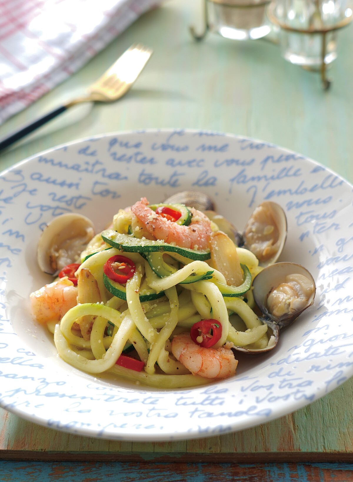 /清單食材/蒜頭25克,蝦仁6尾,蛤蜊10顆,櫛瓜或小黃瓜500克,辣椒5克,橄欖油20ml,玫瑰鹽適量,黑胡椒粉適量,起司粉15克。