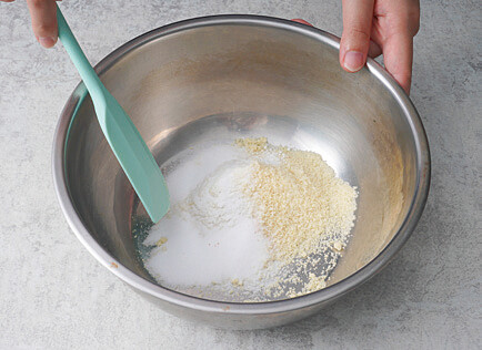 /清單食材/乾性材料:烘焙杏仁粉130克,赤藻醣醇35克,無鋁泡打粉1/2匙,玫瑰鹽1/4匙。濕性材料:融化無鹽奶油30克,檸檬汁5ml,冷藏雞蛋3顆。