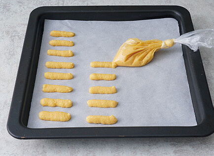 4.將粉糊填入擠花袋,頂端剪1公分的小洞,於鋪上烘焙紙的烤盤中擠出長條形狀。