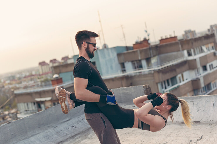 男生呈半深蹲的姿勢,女生利用大腿夾緊男生腰間,運用核心做仰臥起坐。此運動相當考驗彼此默契,可以同時訓練男生臀、腿部肌群和女生腹部與大腿內側。