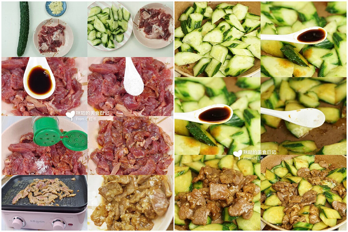 1.黃瓜切成塊狀,牛肉切片,加一匙澱粉、醬油、鹽和胡椒粉醃製15分鐘。