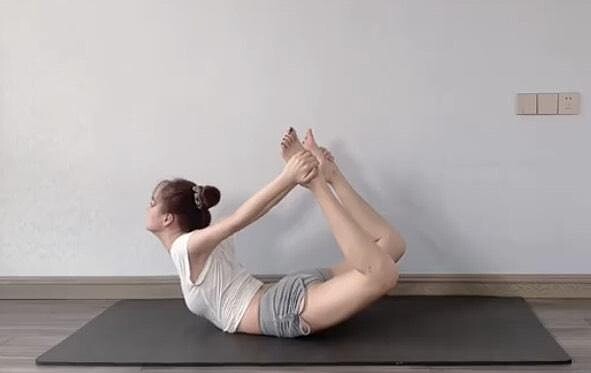 俯臥在瑜珈墊上,雙手自然放置在耳側或者墊子上,雙腿向後上方抬,腳尖繃直。