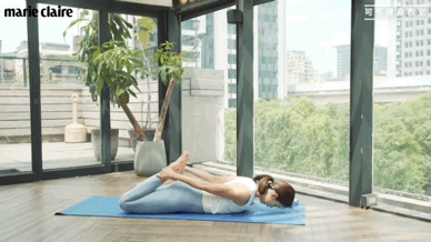 3. 然後比較進階,我們可以把右手抓腳踝,左手抓腳踝,肩膀先往後轉,上半身先起來,然後兩腳踢自己的手,把身體帶上來,找到背部的力量,讓自己更不會駝背,剛剛練習後背的動作,因為會壓迫到你的肚子,所以如果是剖腹產的媽咪,可能要等到傷口好,有的人甚至要等三到六個月。