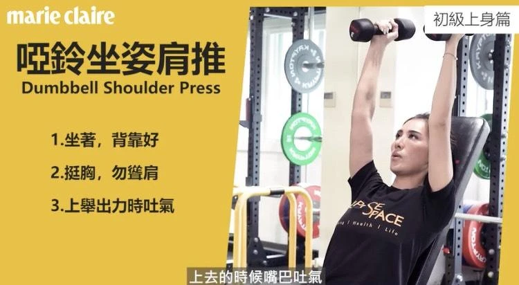 動作1:啞鈴坐姿肩推 (做10下,共3組)