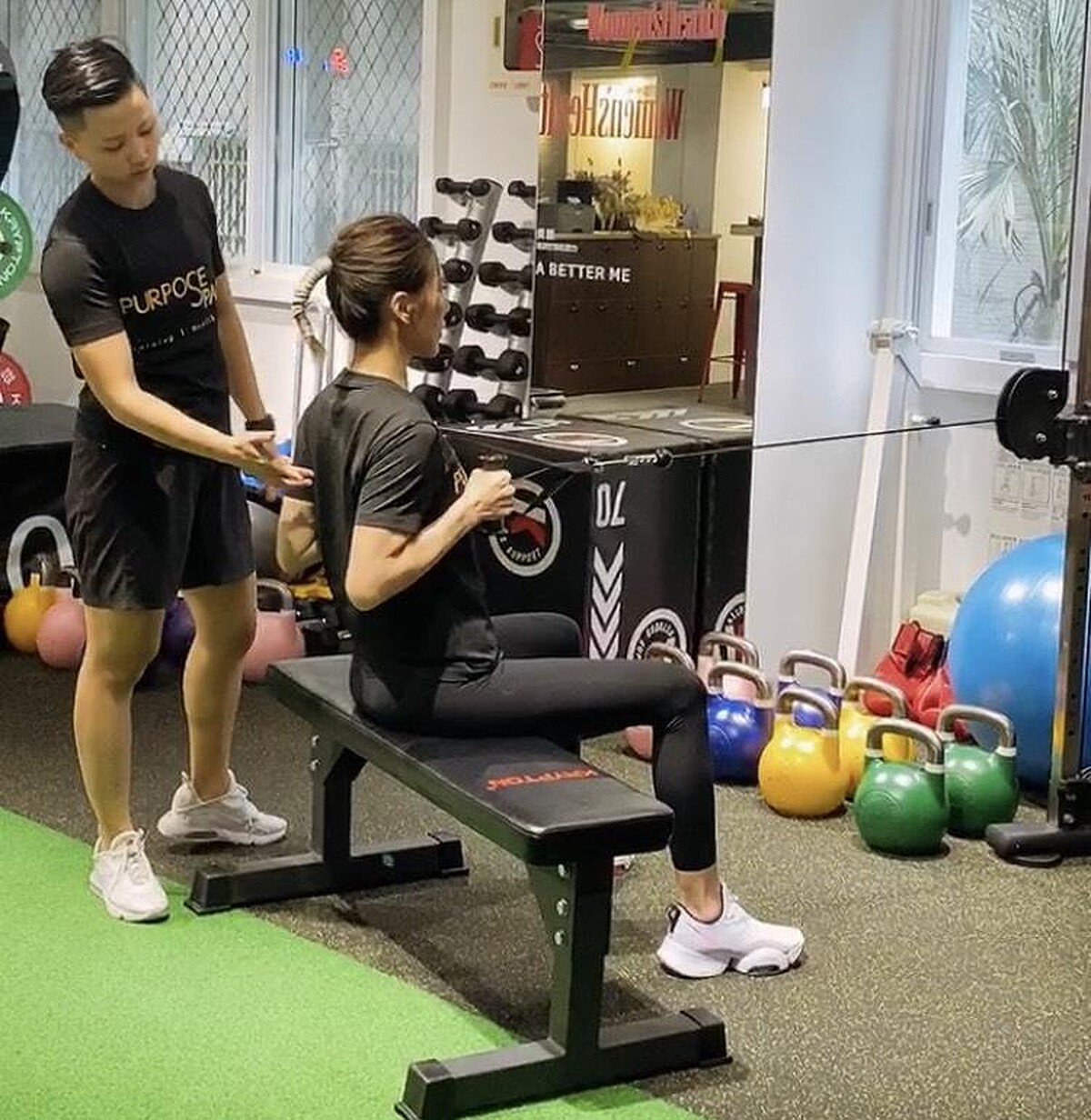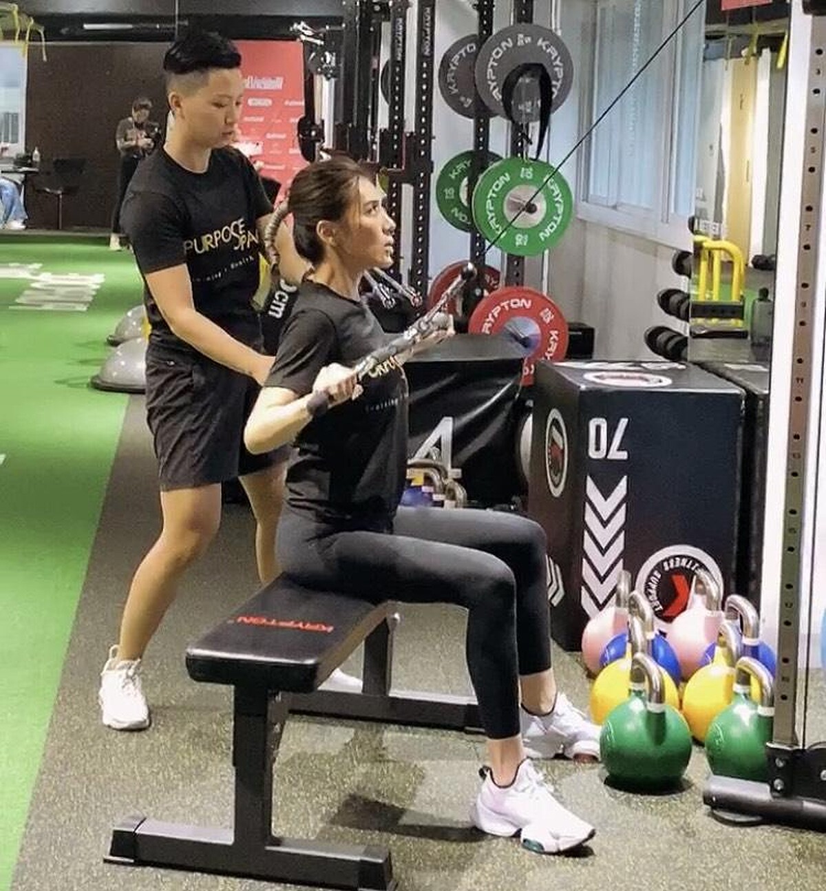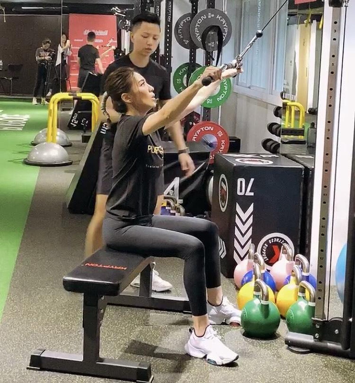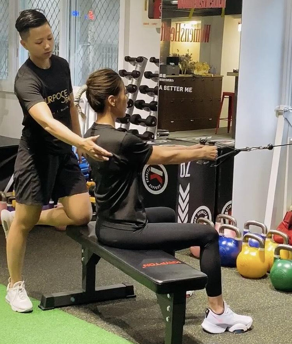 1.一般來說,初階的訓練在重量的選擇上會以比較輕的為主,坐姿,身體打直,不要聳肩,肩膀盡量往下壓,先吸氣,然後吐氣時手肘拉至身體邊,有感覺到肩頰骨往後夾即可。