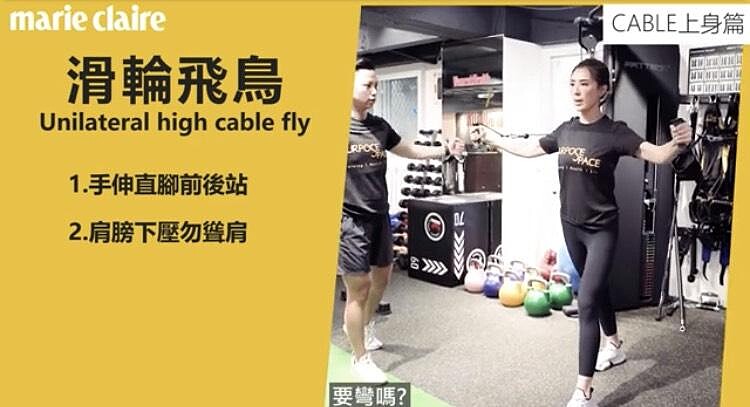 這個動作要訓練的是胸肌的部分,首先雙腳前後站、雙手伸直,肩膀往下壓,然後慢慢往兩側張開雙手,手肘固定,吐氣的時候往內夾,