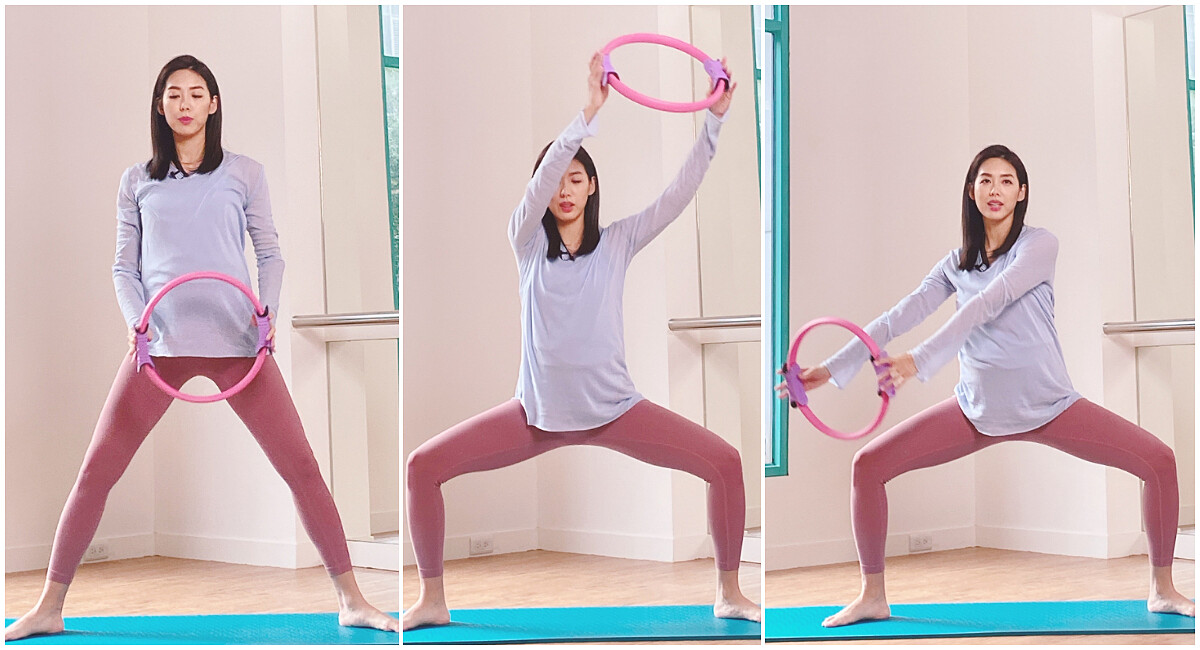 2.然後雙手輔著妳的方向盤(健身圈),讓自己90度下蹲。