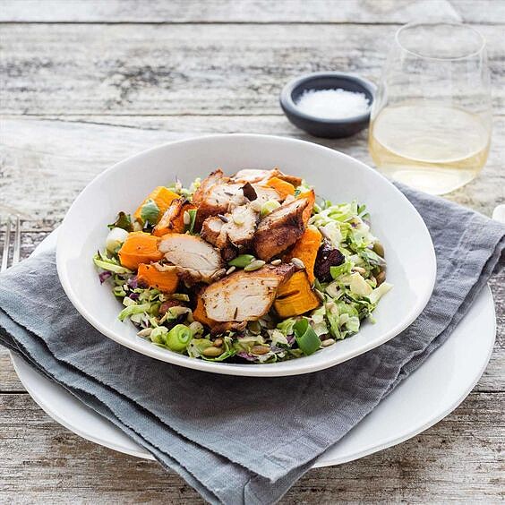 3.將雞胸肉煎熟or即時雞胸肉充分加熱後切片,糖心蛋對切,最後與所有食材組合盛盤,即可食用。