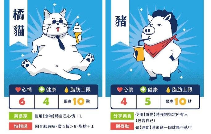 為了兼顧身心健康,除了脂肪爆表就被淘汰之外,幸福瘦桌遊也設計了健康和心情兩個數值,意謂當瘦身過程,也要同時顧及身心平衡,而這也是幸福瘦概念中最關鍵的訊息。