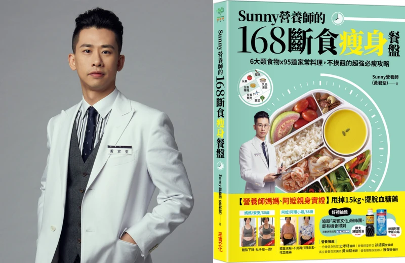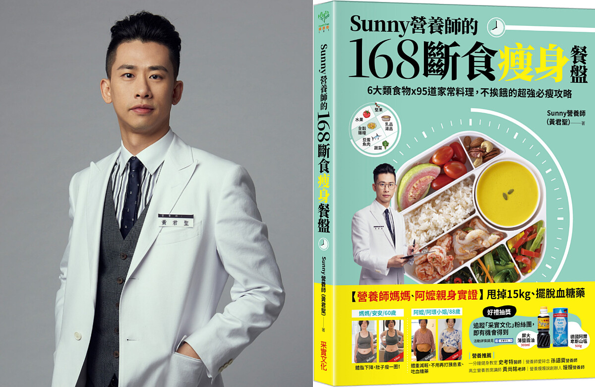 《Sunny營養師的168斷食瘦身餐盤》一書是由營養師Sunny所推出,曾經為了考試將身材管理放一邊的他,考完試後才驚覺肚子已經掛上一圈肉,於是利用自身專業進行瘦身計劃,兩個月減掉8%體脂肪。