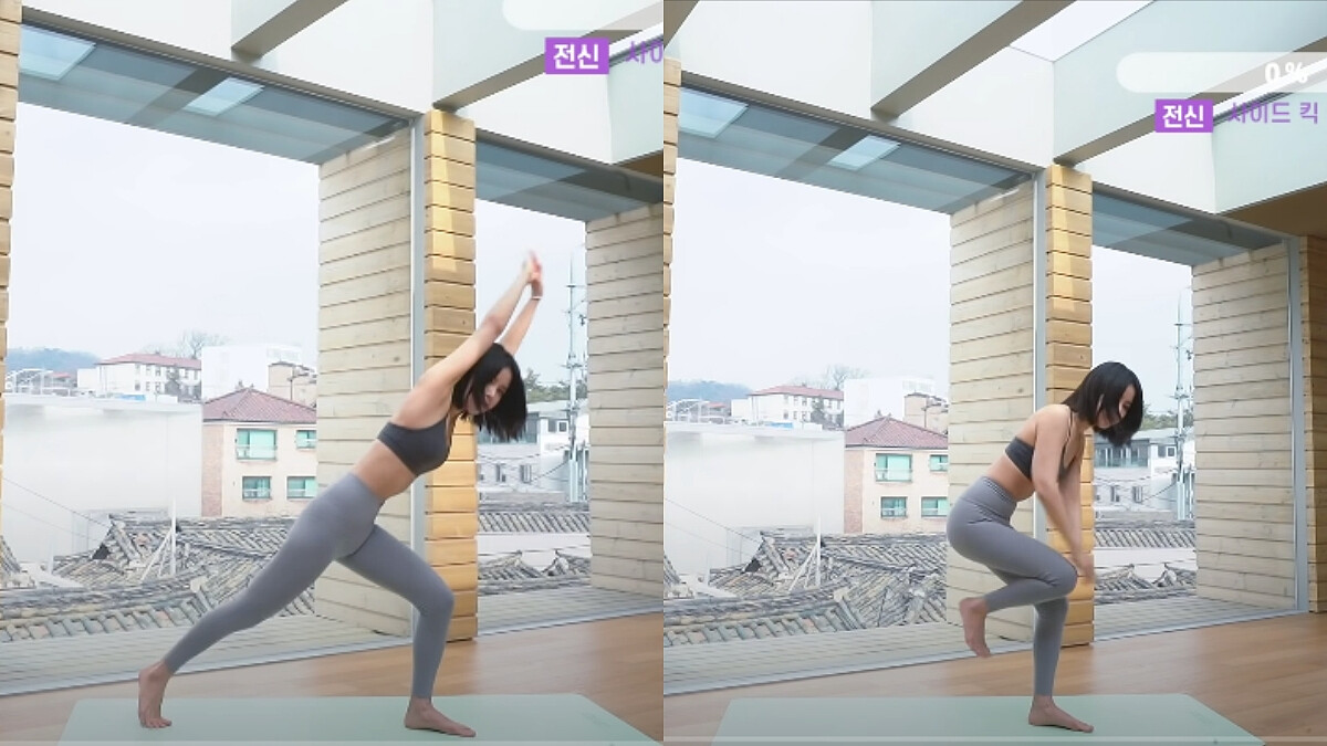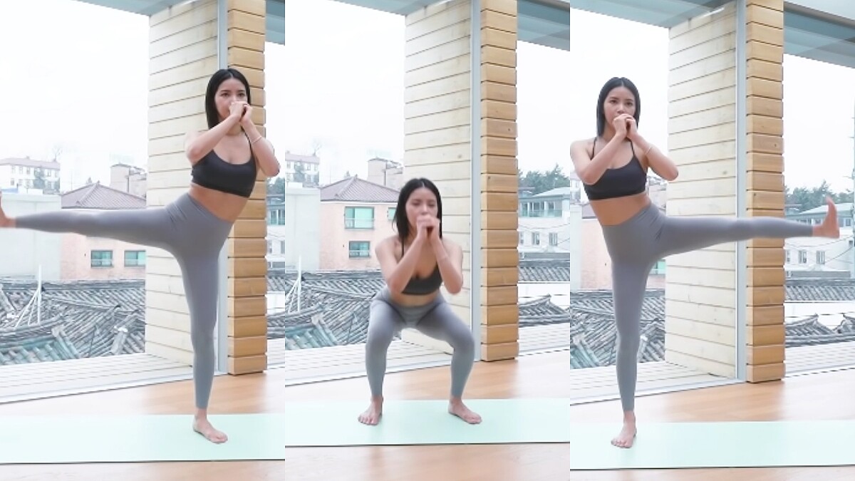 動作一:深蹲側踢腿,雙腳和骨盆同寬,將重心放在臀部向後蹲下,並運用臀部力量站起後將腿向側邊踢,雙腳交替。