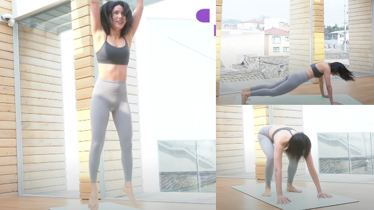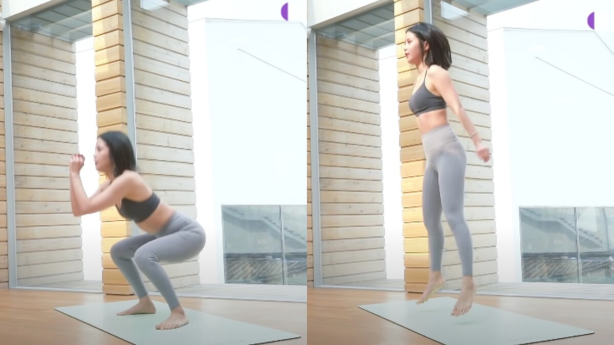 動作二:深蹲後跳起,頌樂也提醒,這個動作要盡量運用核心力量而不是膝蓋。