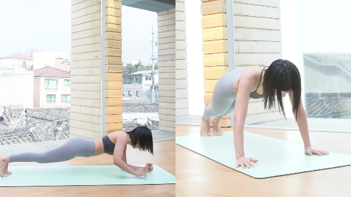 動作五:平板伏地挺身,從平板肘撐開始,接著順序將手打直,運用核心力量將身體撐起,並重複動作。