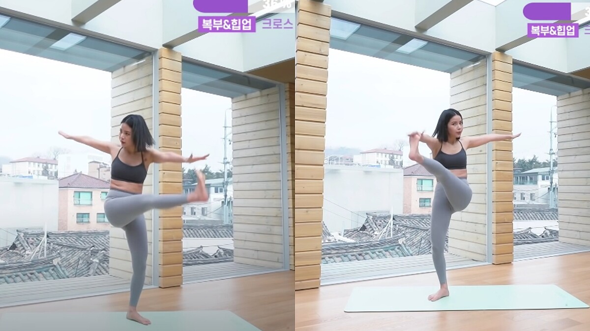 動作一:交叉側踢,首先雙手平舉,接著運用核心、腹肌的力量將雙腳交叉抬起,抬腳的同時用另一側的手向前觸碰腳趾,能夠訓練到側腹。要注意並不是上半身彎腰、駝背往下觸碰,而是要盡量將腳抬高。