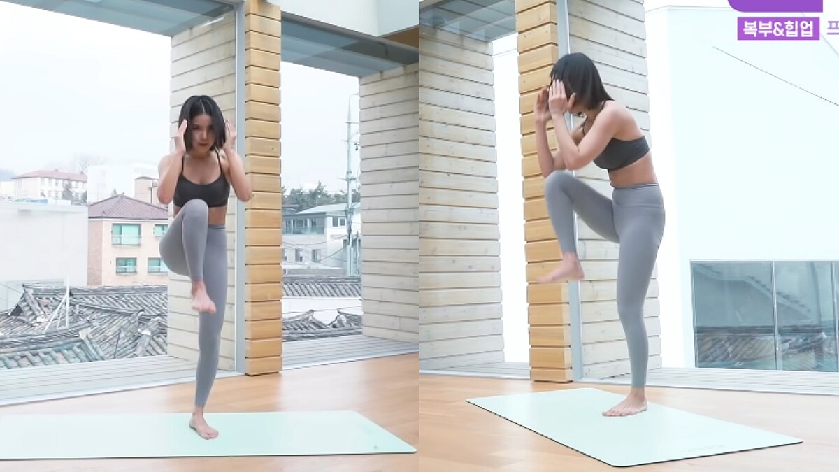 動作三:抬腿捲腹,將重點放在上半身的捲腹動作,要注意背脊依然是打直的狀態,將膝蓋交替抬到胸前,並捲腹用作勢用胸口碰觸膝蓋。