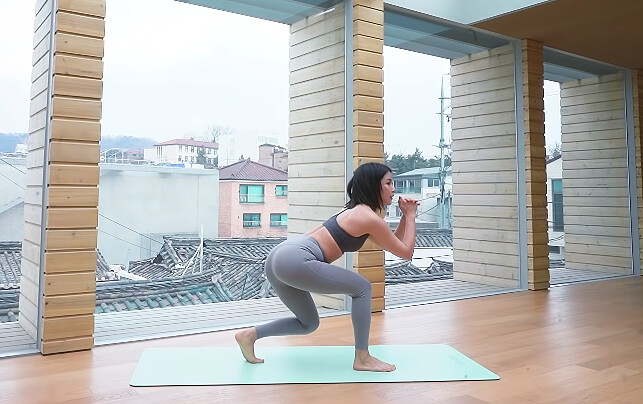 動作二:深蹲,以臀部為重心慢慢的向後蹲,膝蓋不可以超過腳趾。頌樂提醒,這個動作比起快速,慢慢的把動作做確實,更能有效訓練到臀部。