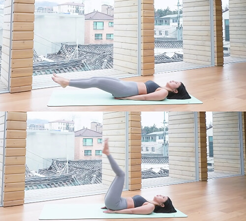 動作六:抬腿,將雙腳打直運用腹肌的力量上下抬,要注意如果用到腰部力量使腰過度上下晃動,很有可能會傷到腰,要注意發力的位置是腹部。