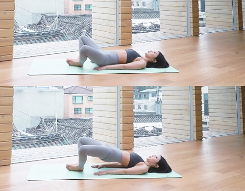 動作七:青蛙橋式,平躺後屈膝,並將雙腳合併於中間的位置,接著用力將臀部舉起來。