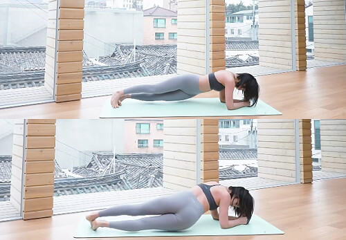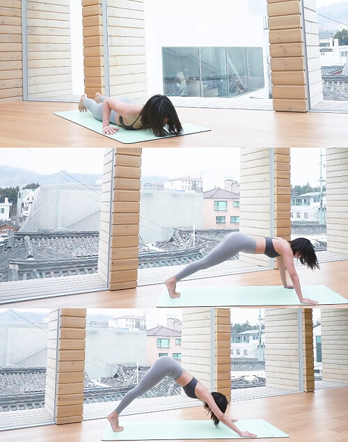 動作六:波浪伏地挺身,將手放在胸旁兩側,運用腹部和手臂的力量撐起全身到抬起臀部,這個動作比較難,也可以用一般的伏地挺身或是膝蓋跪地的伏地挺身取代。