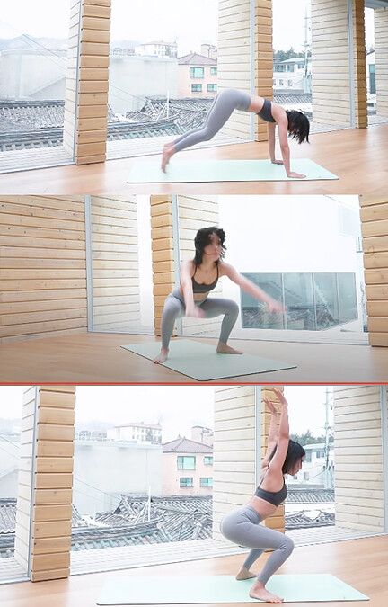動作三:深蹲跳躍,集中在上下蹲的動作,要注意的是背脊要呈現挺直的狀態,而不是彎腰駝背,下蹲同時將手碰觸地板後跳起。