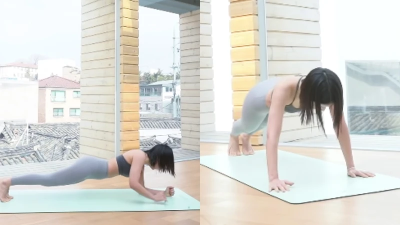 動作四:登山者式,首先趴到平板撐體的姿勢,並將雙腳往前奔跑。是以腹部訓練為主的姿勢,但其實手臂、背部、腿都會訓練到,要保持身體的平衡和穩定,背部也要呈直線,才能正確地鍛鍊。