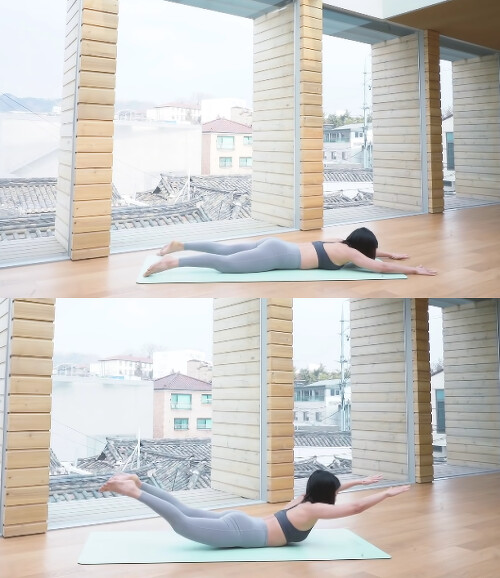 動作六:超人式,先從趴地開始,接著運用核心力量將雙手雙腳向上抬起,重複動作。